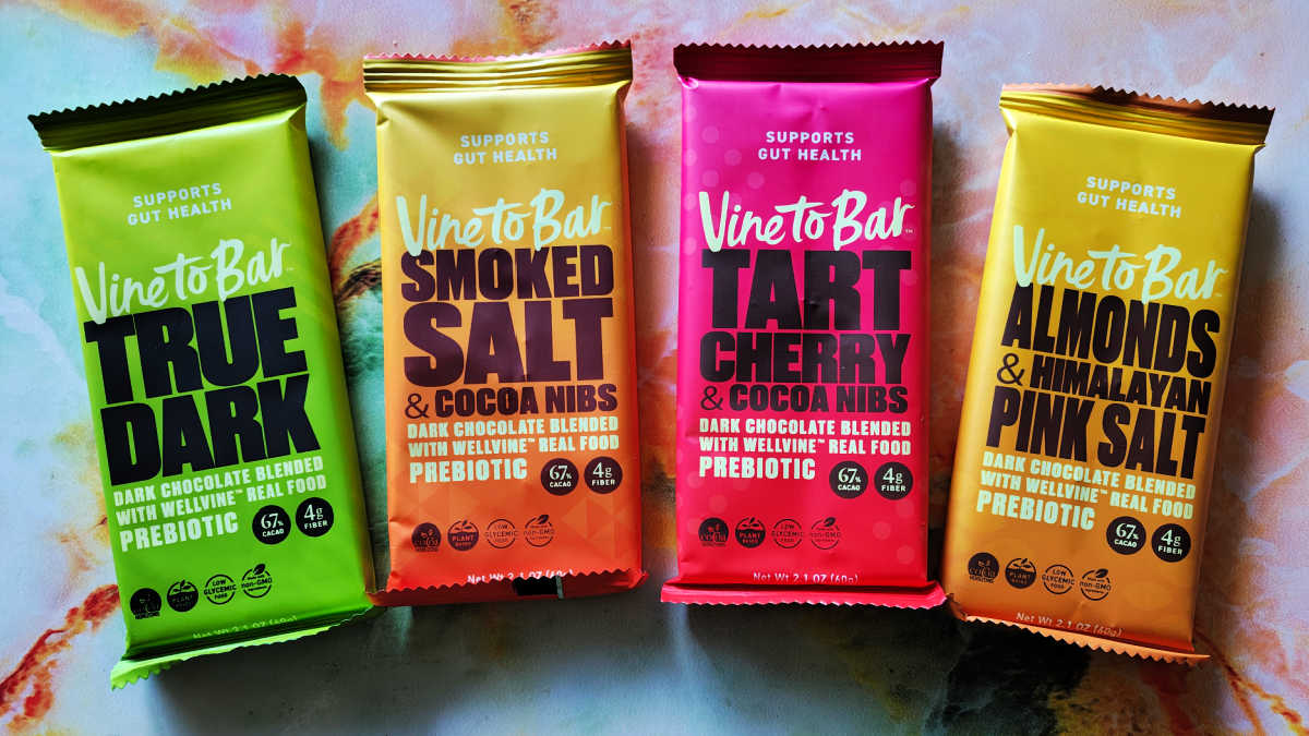 Vine to Bar Dark Chocolate Bars are a premium dark chocolate blended with upcycled Chardonnay grapes (WellVine™).